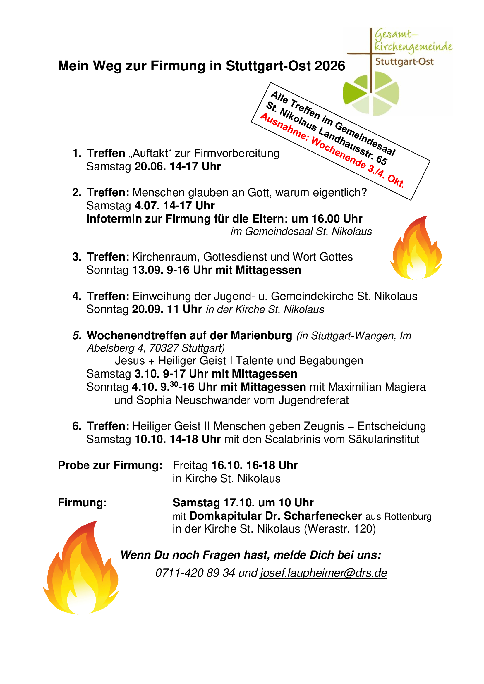 Firmspender wird Domkapitular Dr. Scharfenecker aus Rottenburg sein. Auf dem Weg zur Firmung erwarten Dich Treffen und Gottesdienste, bei denen Du Dich mit den anderen Jugendlichen auf die Firmung vorbereiten kannst und bei denen Deine Fragen zum Glauben ihren Platz haben.